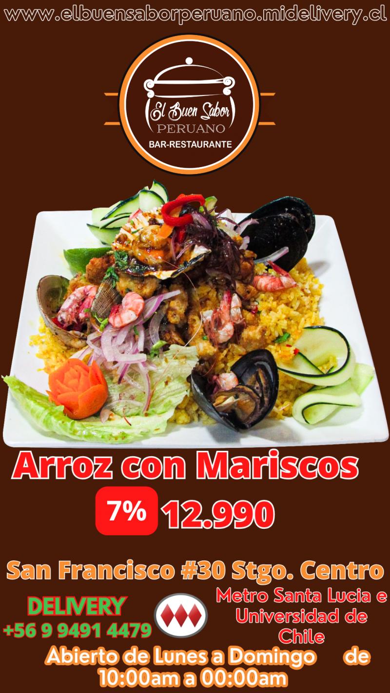 Arros con verduras, salsa de mariscos y mixtura de mariscos.