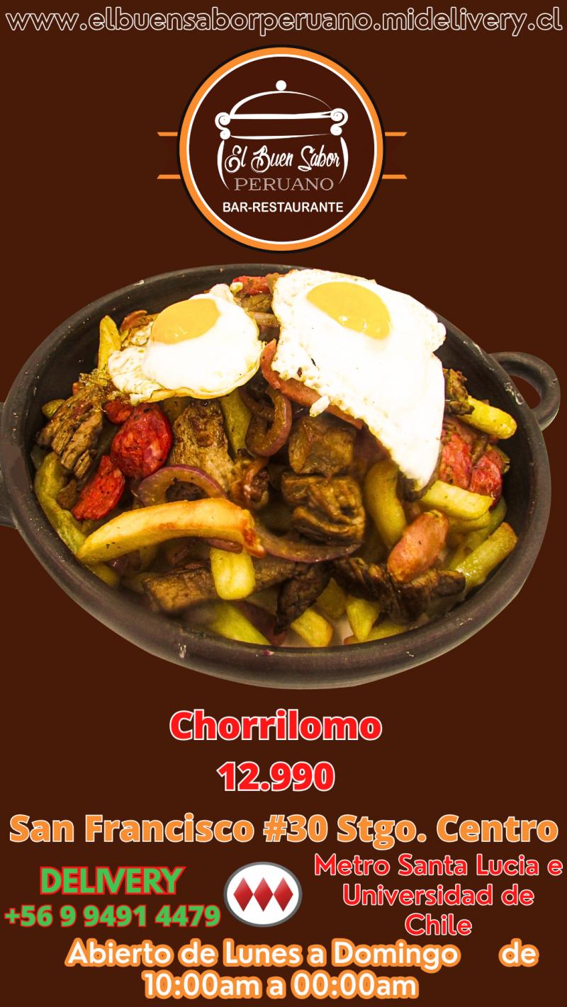 Cebolla morada, tomate, lomo, flameada en vino blanco y salsa de soya, Arros blanco y papas fritas.